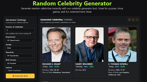 The beauty of the Random Celebrity Generator lies in its international appeal. The tool doesn’t limit users to one region — instead, it offers names from across the world.